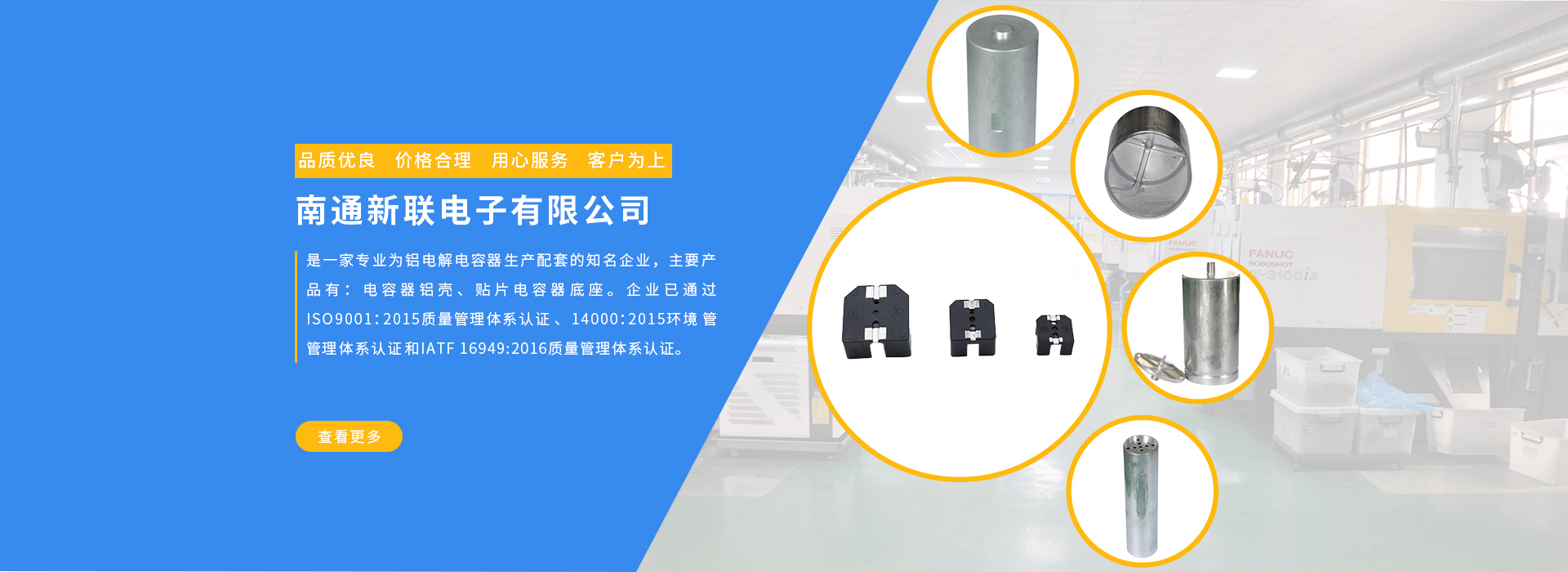 南通新聯(lián)電子有限公司是一家專(zhuān)業(yè)為鋁電解電容器生產(chǎn)配套的知名企業(yè),主要產(chǎn)品有:電容器鋁殼、貼片電容器底座。企業(yè)已通過(guò)ISO99001:2015質(zhì)量管理體系認(rèn)證和14000:2015環(huán)境管理體系認(rèn)證。企業(yè)... MORE